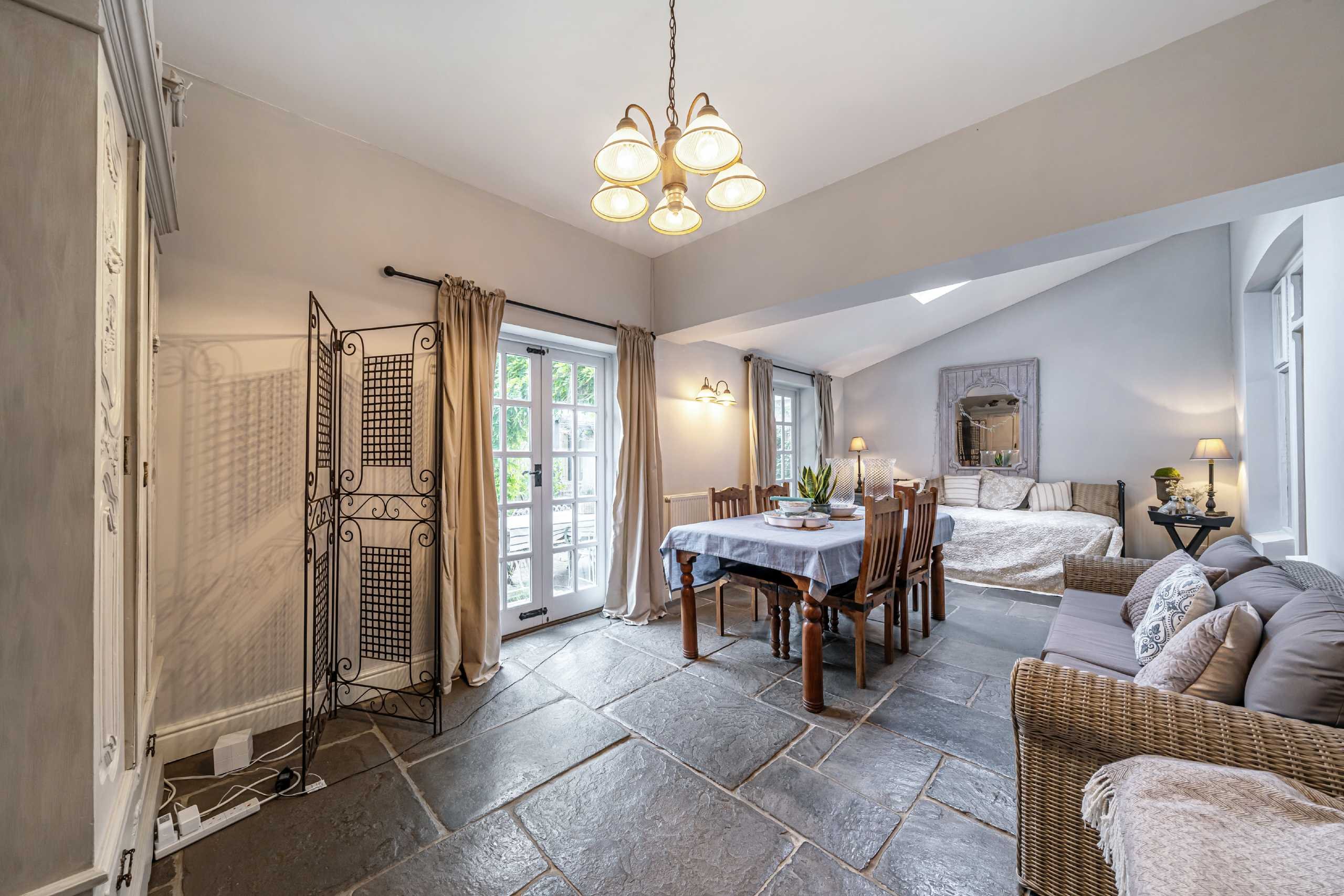 The delightful dining room, part of the initial extension, has traditional flagstone flooring and two pairs of French doors opening to a gorgeous Italian-style rear patio. Natural light floods into the dining room from a Velux window in the roof. "It is a light and airy space, a bit like a garden room."