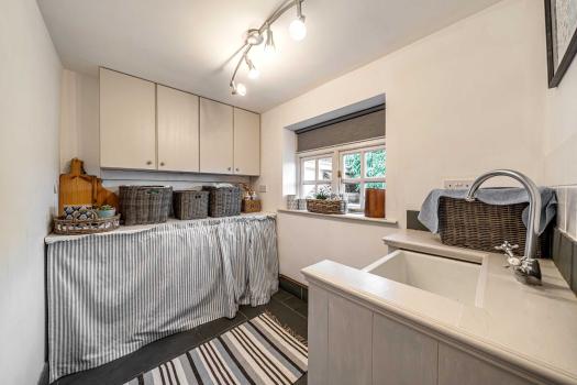 Easily accessible from the kitchen is a utility room with fitted wall and base units, a Belfast sink, grey slate flooring, space and plumbing for a washing machine and space for a tumble dryer. There is also a useful walk-in larder, located off the back of the dining room. A stable door from the inner hallway gives access to the rear patio.