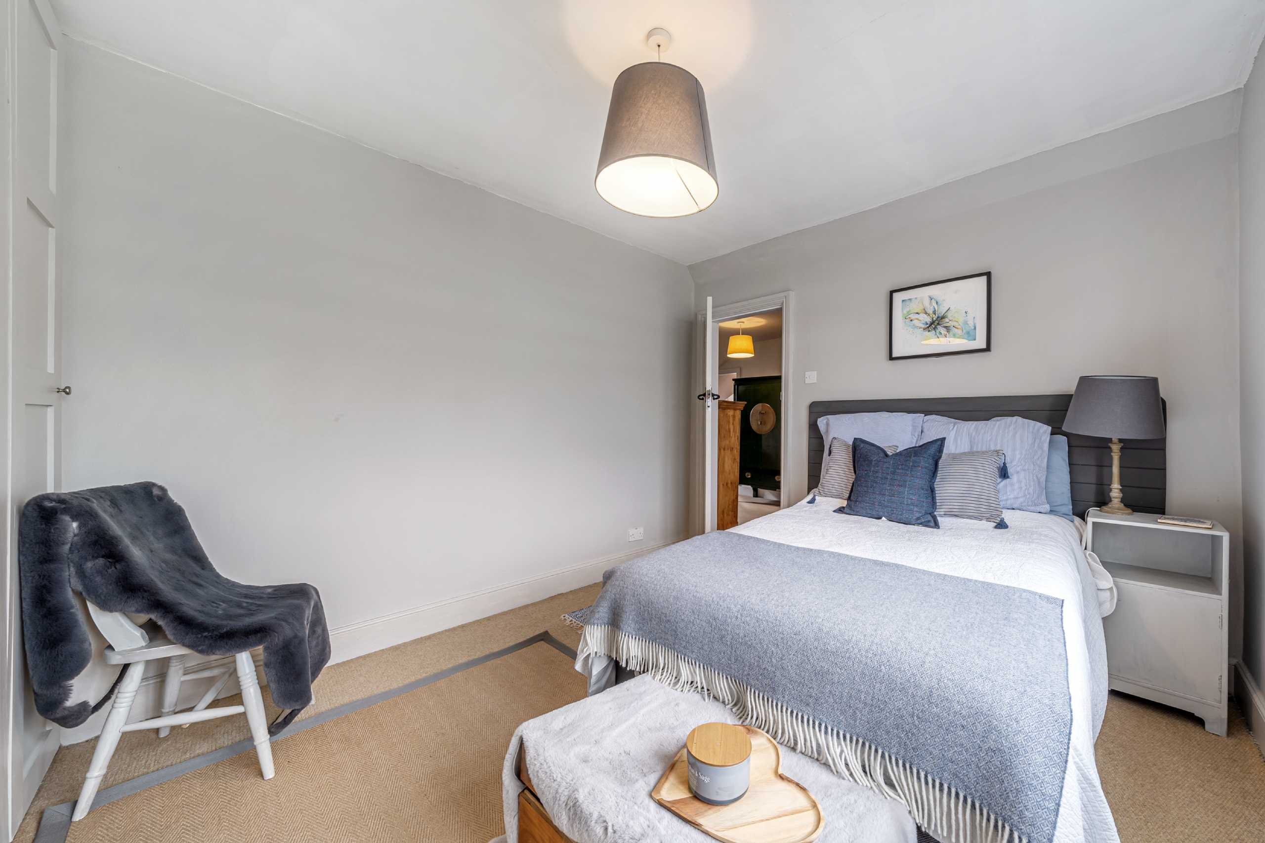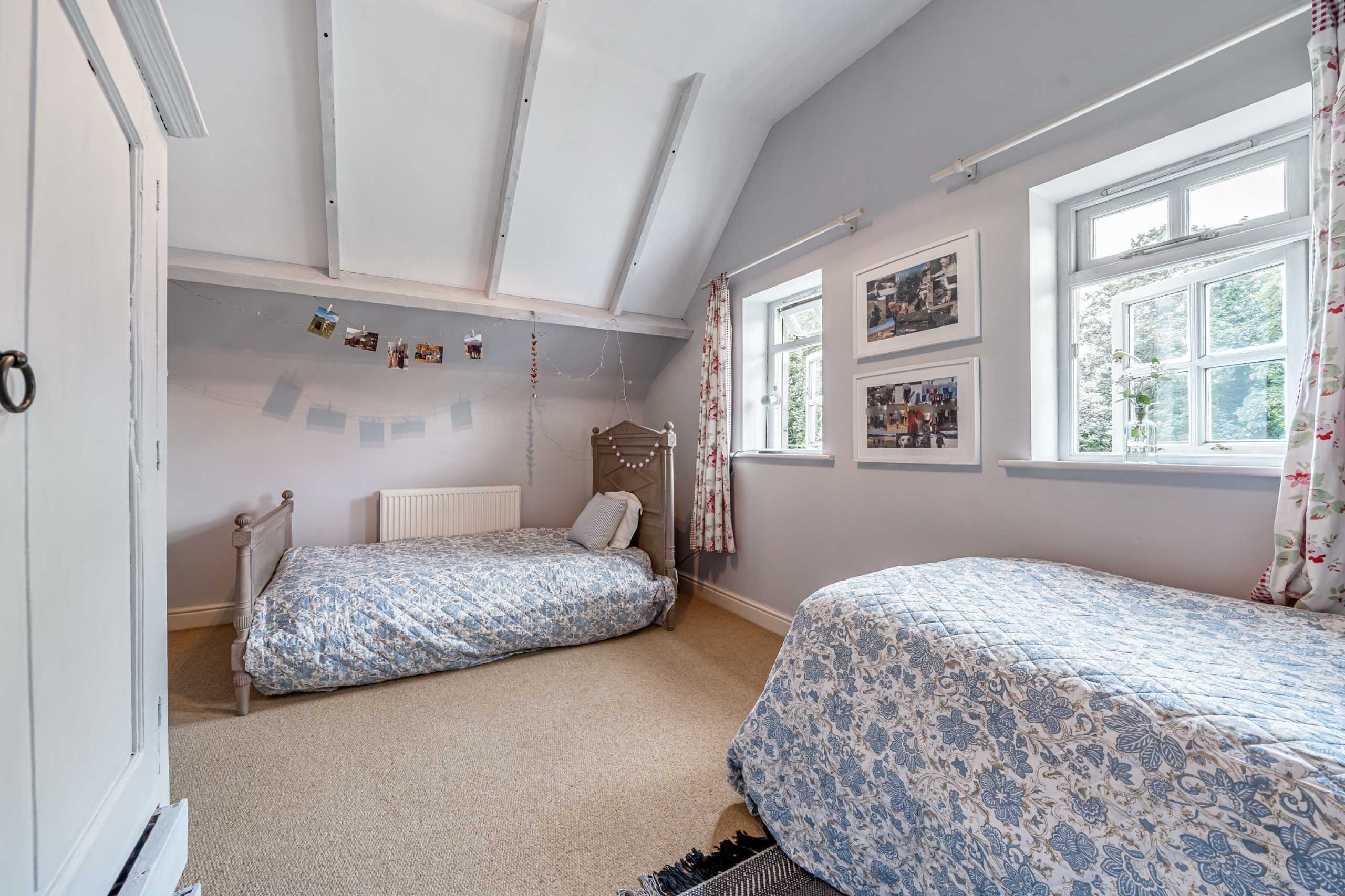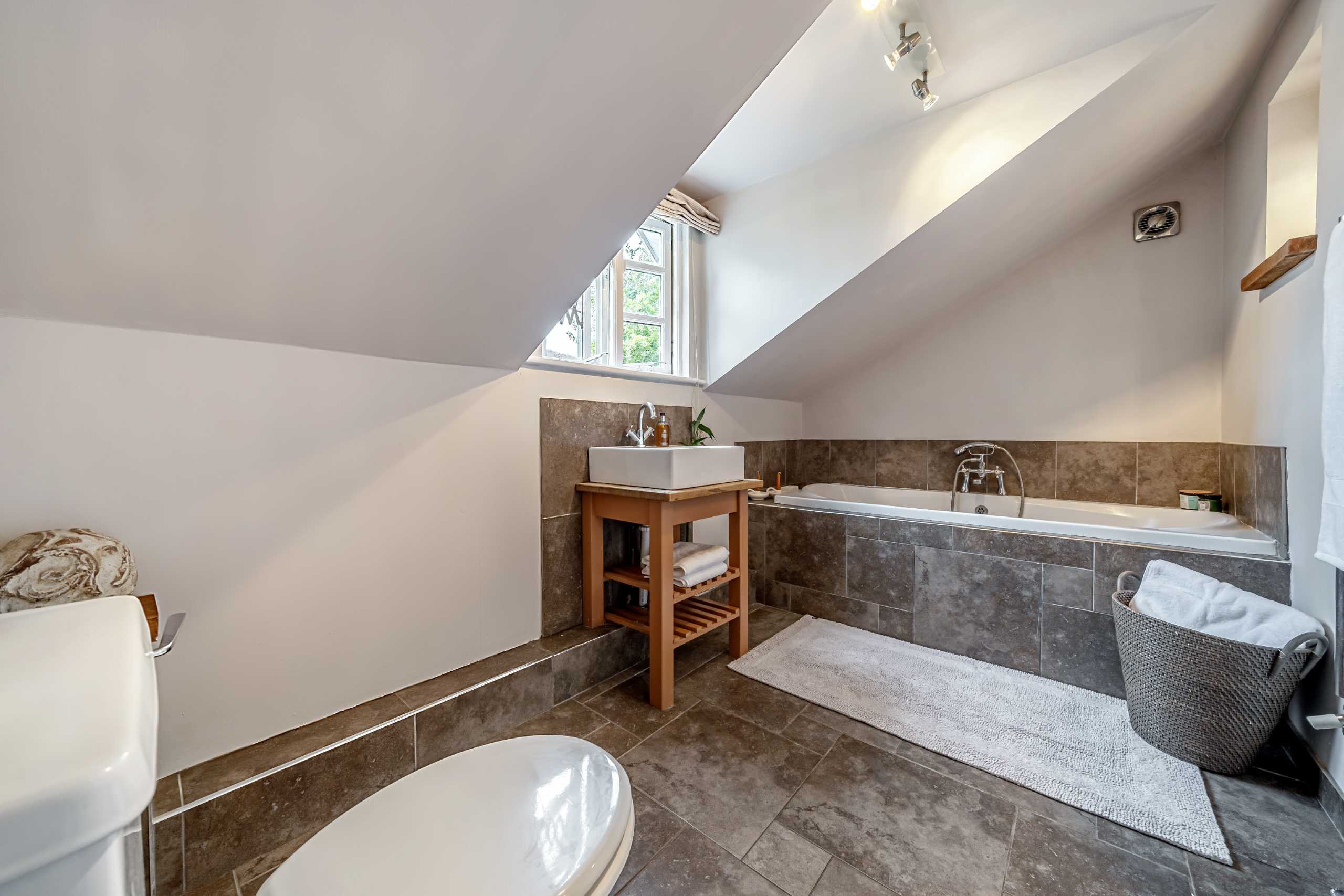The three further double bedrooms include one in the original cottage, which has a lovely Victorian wrought iron fireplace. Another has a range of bespoke built-in furniture along one wall and the third is a charming room with a vaulted ceiling, exposed, painted roof trusses and two windows to the side of the house. These bedrooms share an attractive modern family bathroom, with a bath with a hand-held shower and a vanity basin on a wooden vanity unit.