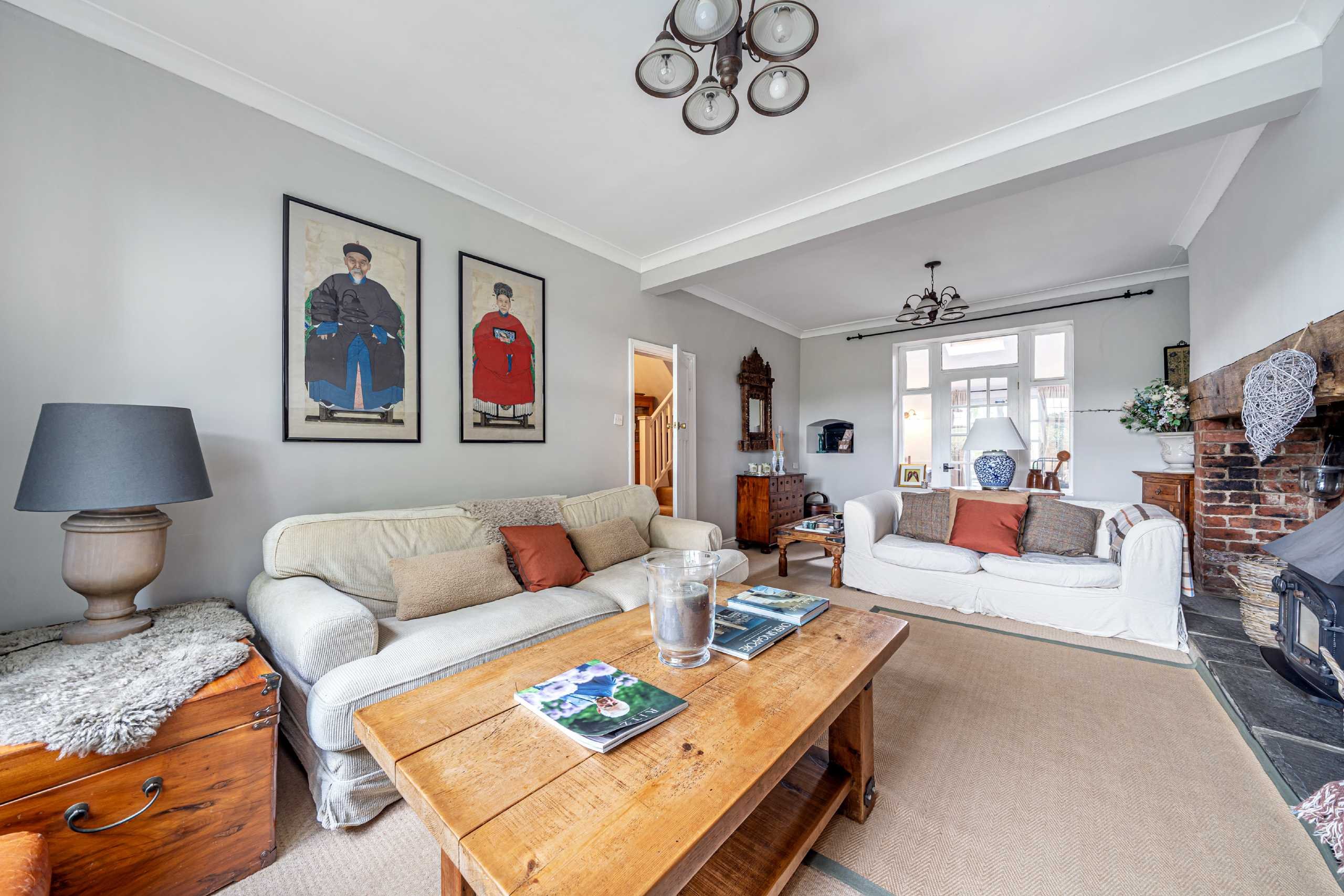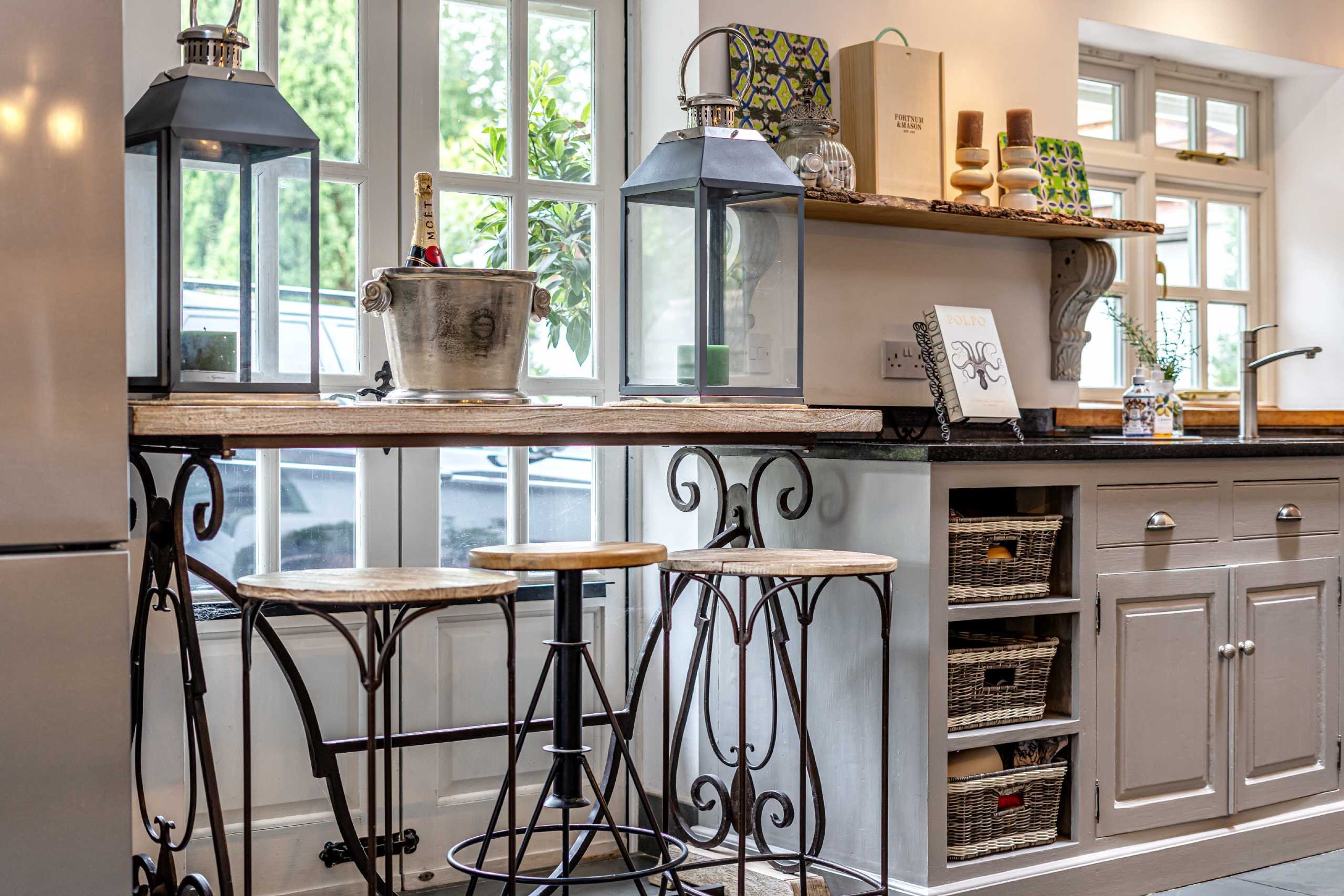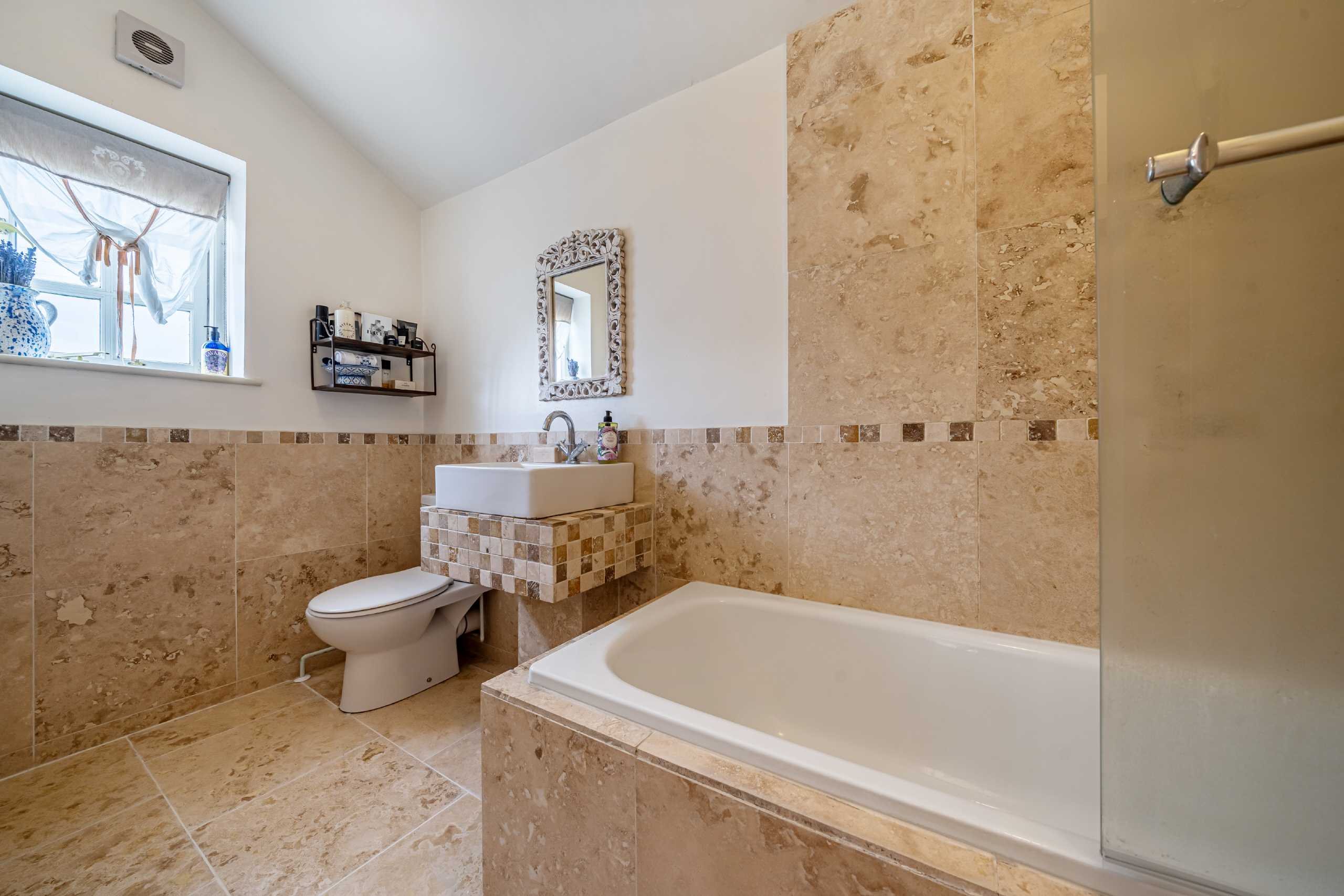 The three further double bedrooms include one in the original cottage, which has a lovely Victorian wrought iron fireplace. Another has a range of bespoke built-in furniture along one wall and the third is a charming room with a vaulted ceiling, exposed, painted roof trusses and two windows to the side of the house. These bedrooms share an attractive modern family bathroom, with a bath with a hand-held shower and a vanity basin on a wooden vanity unit.