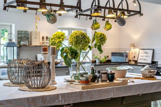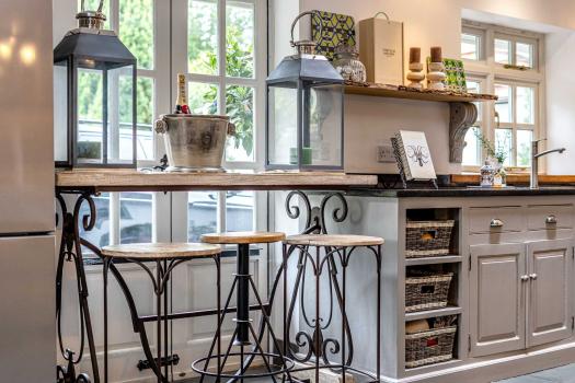 From the dining room a door opens to an inner hallway, from which a wooden latch door leads to the stunning kitchen/diner in the newest part of the house. This room can also be accessed directly from the main hallway. The room is filled with natural light from two Velux rooflights, wooden double glazed windows to the front and side (with solid oak windowsills) and French doors. The kitchen is fitted with stylish bespoke hand-made base units painted in Farrow & Ball Worsted, under black granite worktops, incorporating a Belfast sink. There is an electric range-style cooker and an inbuilt dishwasher, plus space for an upright fridge/freezer. Contemporary grey slate tiles have been chosen for the flooring and the room features exposed painted ceiling beams and an open fireplace with an oak beam over and a slate and brick hearth. This houses a Villager wood burning stove.