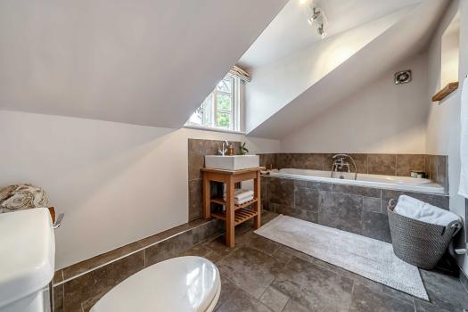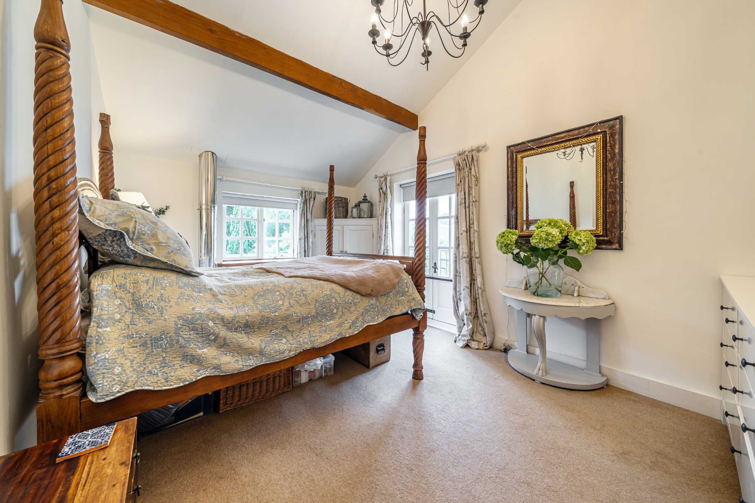 Next to the utility room is a shower room and off the main entrance hallway there is a downstairs cloakroom. Stairs rise from the entrance hallway to a landing lit by a sun tunnel and a window to the front elevation. The landing showcases some of the exposed stonework of an original exterior wall. The superb principal bedroom has a vaulted ceiling and features oak beams. There is a window to the side elevation, with a deep oak window ledge. French doors open to a Juliet balcony which overlooks the back gardens. There is a stylish, modern ensuite bathroom, with a bath with a shower over and a washbasin on a purpose-built tiled pedestal.