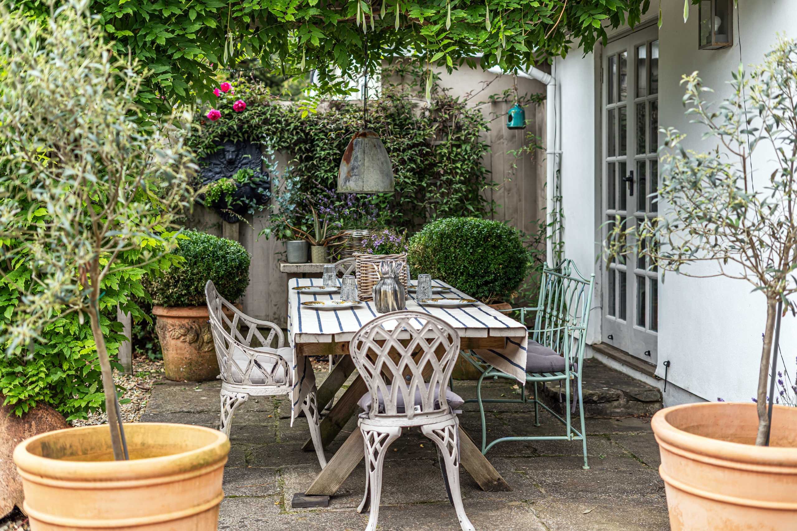 The Italian-style, paved courtyard is sheltered by a wooden pergola with wisteria growing over it. It can be accessed from the French doors from the dining room and makes a wonderful outdoor dining and entertaining space.