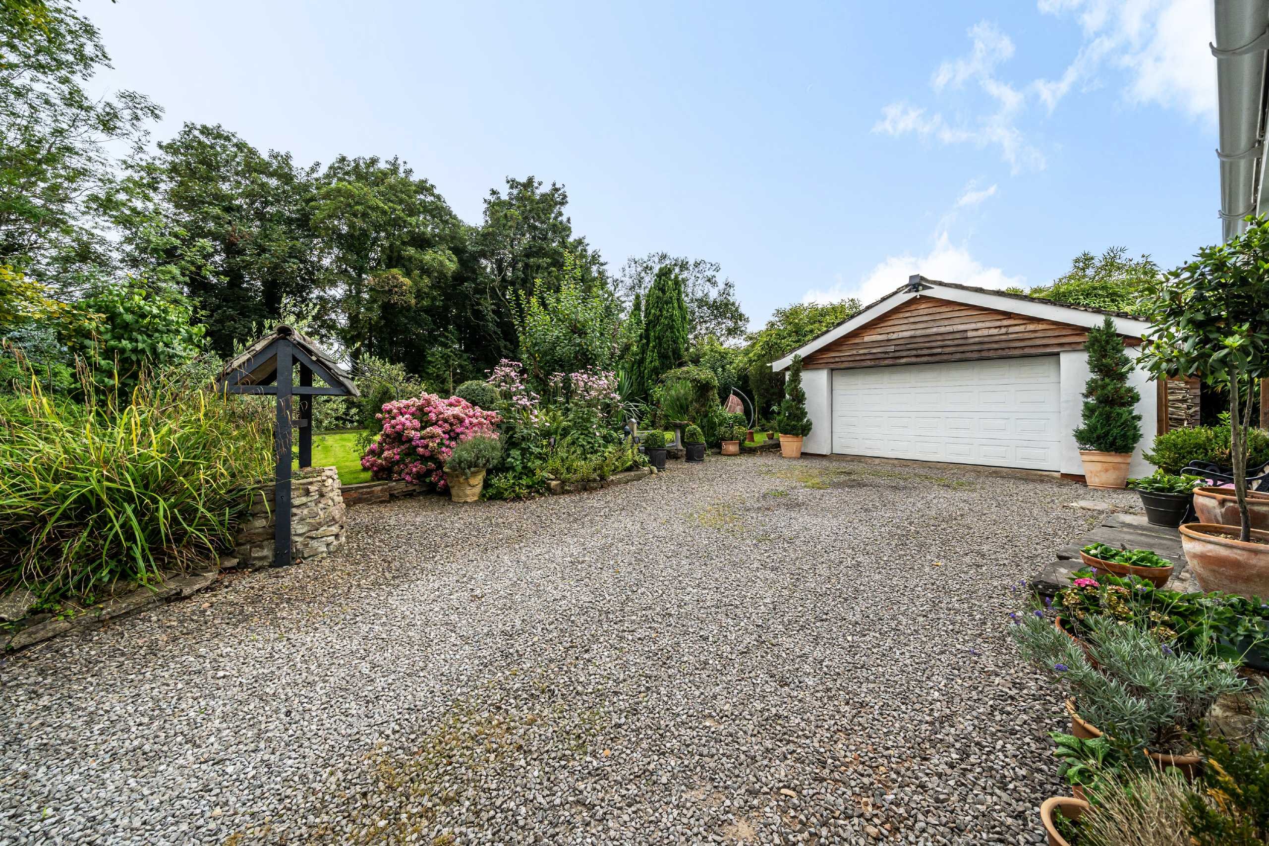 Outside - A wooden five bar gate leads from Began Road onto a gravelled area, with parking for at least four cars and giving access to a double garage clad in Welsh larch and with electric doors. To one side of the gravelled area are shrub borders and a feature well, built of reclaimed river stone. There is a log store alongside the garage.
